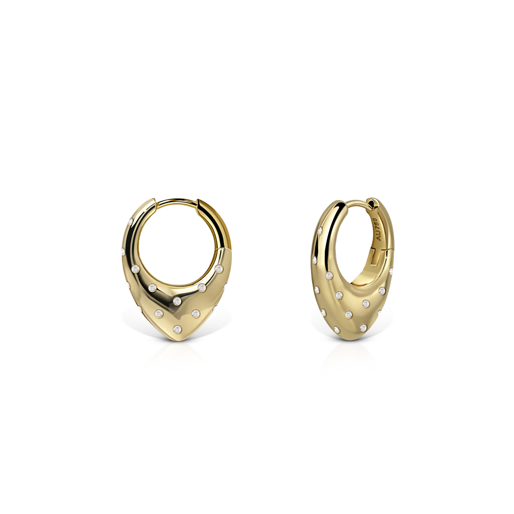 Crafted in polished 18k solid gold, each earring is designed with a softly contoured profile that sits comfortably on the ear. The scattered diamond detailing adds subtle texture and light, balancing the bold form with precise craftsmanship.